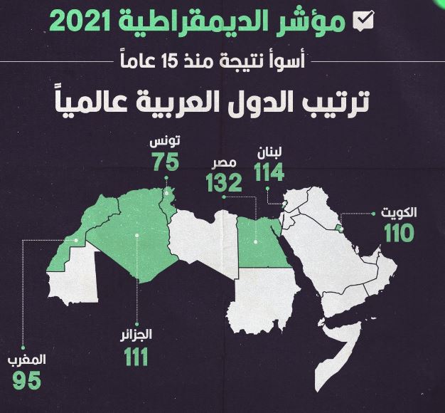 واعتبر موقع "BBC News " عربي أن تقرير مؤشر الديمقراطية حول العالم للعام 2021، رسم صورة قاتمة للمنطقة العربية، إذ جاءت منطقة الشرق الأوسط وشمال إفريقيا، في أدنى المراتب من بين جميع المناطق التي يغطيها التقرير، في ظل وجود خمس دول من أصل عشرين منها، ضمن أدنى مستويات التصنيف، ويشير التقرير أيضا، إلى أنه ومن بين العشرين دولة عربية، هناك 17 دولة تقع ضمن تصنيف الدول الاستبدادية.