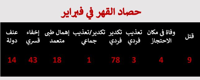 وشملت الانتهاكات 3 حالات وفاة داخل مقار الاحتجاز التي تفتقر لأدنى معايير السلامة و19 حالة إهمال طبي و5 من حالات التعذيب الفردي و46 حالة تكدير فردي و6 حالات تعذيب وتكدير جماعي و56 حالة إخفاء قسري و7 حالة عنف للدولة.