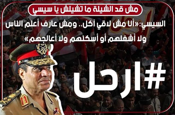 أما الإعلامي أسامة جاويش فكتب: "ارحل يا سيسي ليس مجرد هاشتاج يغرد به ملايين المصريين ، مطالبين الجنرال الأسوأ في تاريخ البلاد؛ في ما يتعلق بانتهاكات حقوق الإنسان بالرحيل عن منصبه والتوقف عن سياساته القمعية بحق المصريين، وإنما هو تجسيد لواقع أليم يعاني منه الشعب المصري بمختلف طوائفه تحت حكم السيسي".