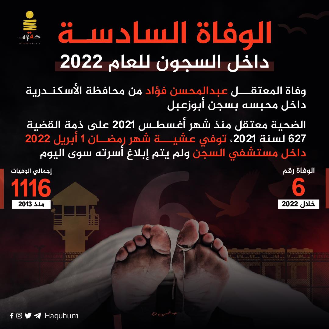 استُشهد المعتقل عبدالمحسن فؤاد من محافظة الإسكندرية داخل محبسه بسجن أبوزعبل، عشية شهر رمضان الأول من إبريل داخل مستشفى السجن، ولم يتم إبلاغ أسرته سوى يوم الأحد ثاني أيام شهر رمضان المبارك.