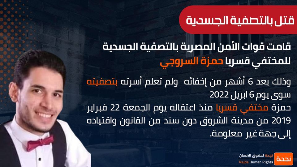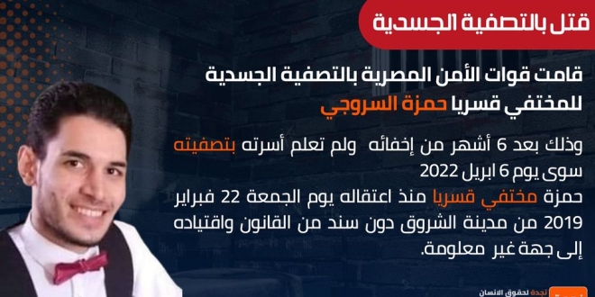 وقالت المنظمة إن قوات الانقلاب قامت بالتصفية الجسدية للمختفي قسريا حمزة أحمد سيد محمد السروجى الطالب بكلية الدراسات الإسلامية بجامعة الأزهر بعد 6 أشهر من إخفائه ولم تعلم أسرته بتصفيته سوى أمس الأربعاء 6 إبريل.