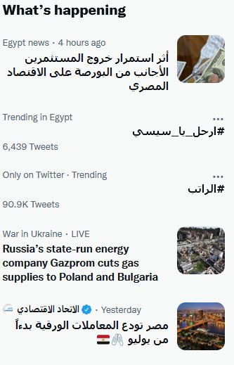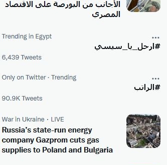 تصدر هاشتاج #ارحل_يا_سيسي موقع "تويتر" لليوم الثاني على التوالي، مكررا تصدره ربما لعشرات المرات السابقة خلال السنوات الأخيرة من حكم العسكر، وكانت هذه المرة لافتة بعد أن جاءت مع تكرار من زعيم الانقلاب الدعوة إلى حوار وطني يشمل الجميع فيستضيف كومبارس انتخابات 2014 حمدين صباحي الذي لجأ عازفا عن تبعات قول الحق في الشارع السياسي إلى المطبخ ، كما استضاف أيضا مخرج 30 يونيو ونائب الفيديوهات الإباحية خالد يوسف.