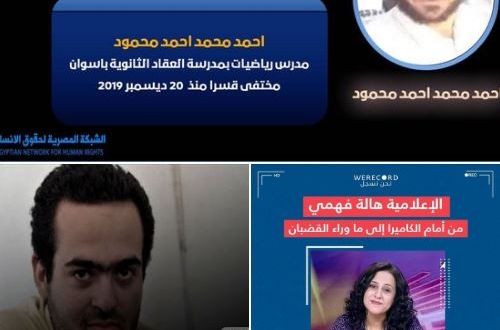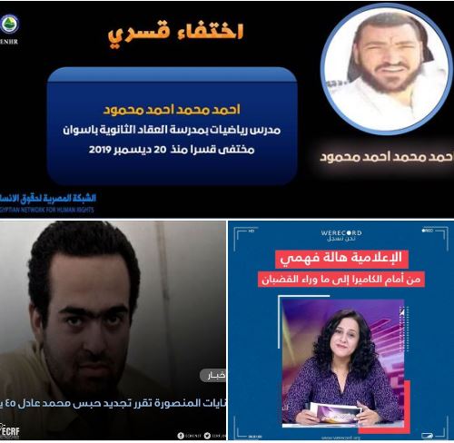 ضمن حملة "خرّجوهم كفاية كدة" وثقت الشبكة المصرية لحقوق الإنسان إخفاء قوات الانقلاب بمحافظة أسوان مدرس الرياضيات بمدرسة العقاد الثانوية بأسوان أحمد محمد أحمد محمود منذ اعتقاله في 20 ديسمبر 2019 أثناء عودته من إيصال ابنته للمدرسة و اقتياده لجهة غير معلومة حتى الآن.