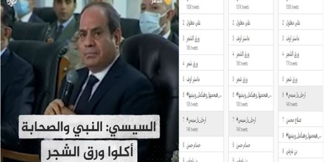 تصدر هاشتاج #ارحل_يا_سيسي مواقع التواصل الاجتماعي، بعد تبريره الجوع الذي يعيشه الشعب المصري بحديث عن حصار الصحابة وأكلهم لـورق الشجر،  مطالبا المصريين بالصبر وتحمل الأزمة الاقتصادية ، محذرا لهم من عدم الاعتراف بما يدعي أنه إنجازات.