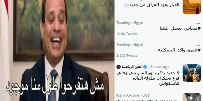تصدر هاشتاج #مبقاش_بيخيل_علينا على موقع التواصل الاجتماعي "تويتر" كاشفا ارتفاع درجة الوعي عند الشعب المصري من خلال تعليقات ناشطين على خطابات السيسي التي عادة ما تكون هرتلة ارتجالية مزعجة ، إلا أنها توضح الخلل الخطير الذي أصاب مصر وتقف وراءه نفسية مريضة معقدة يتتبع صفات المنافقين وأولها الكذب والغدر والتضليل والخيانة.