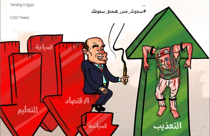 تصدر هاشتاج #سجونك_مش_هتمنع_سقوطك بين الأعلى تداولا على منصة التواصل الاجتماعي "تويتر" في عودة جديدة للناشطين للتصدر مع يوم الجمعة، مع استمرار سياسة الاعتقالات بالأخص مع الإسلاميين وإطلاق حوار مع عناصر جبهة ما يمسى ب"الإنقاذ" وسط فشل سياسي وانهيار اقتصادي، وتضخم وقفزات غير مسبوقة في الأسعار، منذ بدء الحرب الروسية في أوكرانيا في 24 فبراير الماضي، وفي وقت بلغت فيه ديون مصر؛ 392 مليار دولار بنهاية العام المالي 2020-2021، ويشمل ذلك 137 مليار دولار من الديون الخارجية، وهو أعلى 4 مرات مما كان عليه عام 2010 (33.7 مليارات دولار)، ويشمل أيضا ديونا داخلية بقيمة 255 مليار دولار -وفقا للبنك المركزي المصري- أي ما يقرب من ضعف الدين المحلي عام 2010.