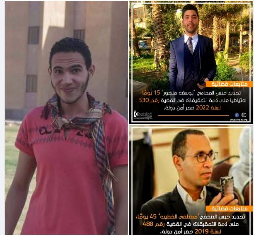 فيما وثق المركز الإقليمي للحقوق والحريات تجديد حبس المحامي "يوسف منصور" 15 يوما احتياطيا على ذمة التحقيقات في القضية رقم 330لسنة 2022 والصحفي "مصطفى الخطيب" 45 يوما، على ذمة التحقيقات في القضية رقم 488 لسنة 2019 باتهامات مسيسة تزعم الانضمام لجماعة محظورة ونشر أخبار كاذبة .