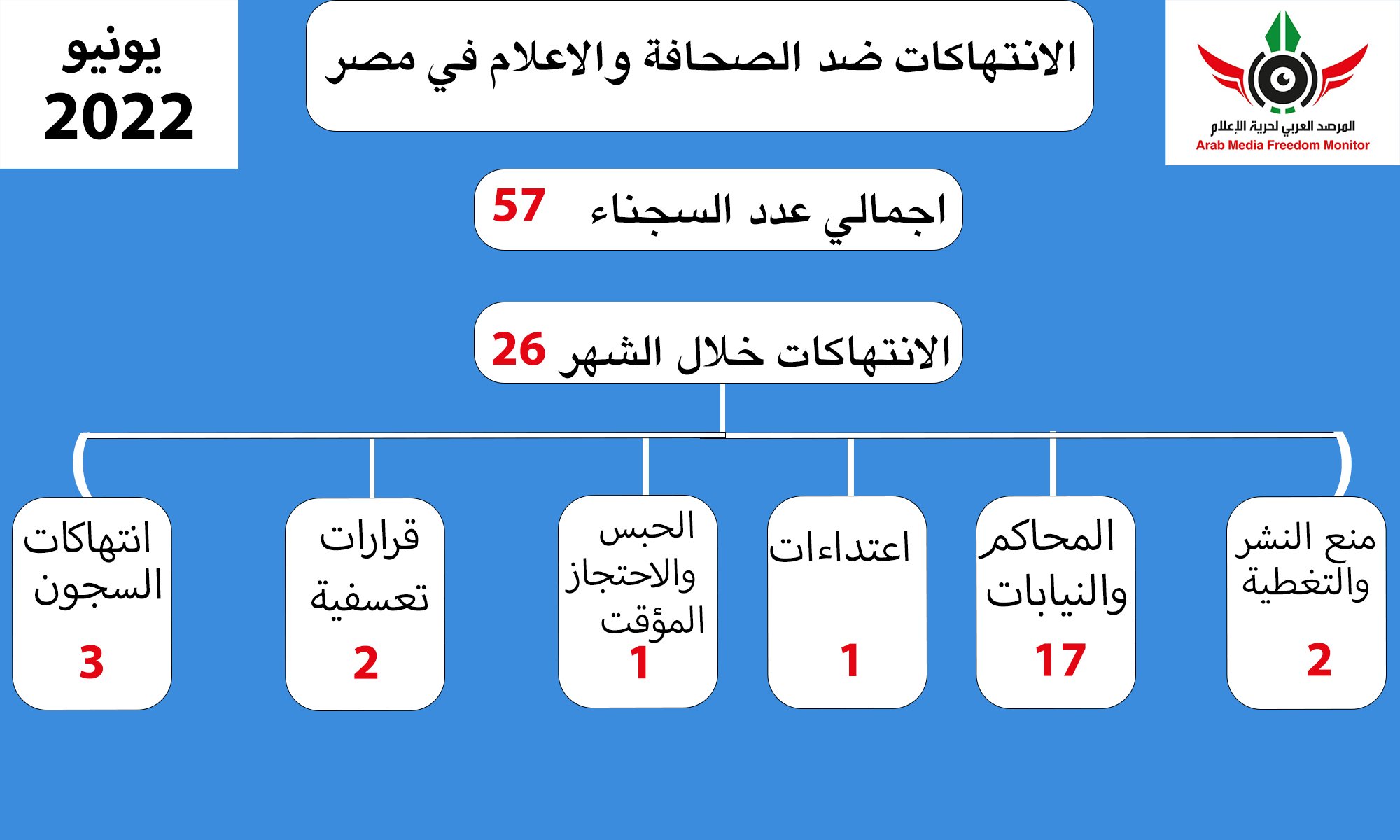 وثق المرصد العربي لحرية الإعلام 26 انتهاكا متنوعا في تقريره عن انتهاكات حرية الإعلام في مصر خلال يونيو 2022 واستمرار حبس 57 صحفيا وصحفية مع نهاية يونيوالمنقضي ، بما يعكس تواصل سياسات القمع والانتهاكات لحرية الإعلام .