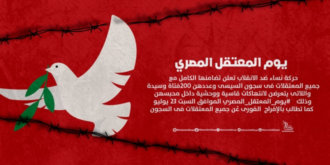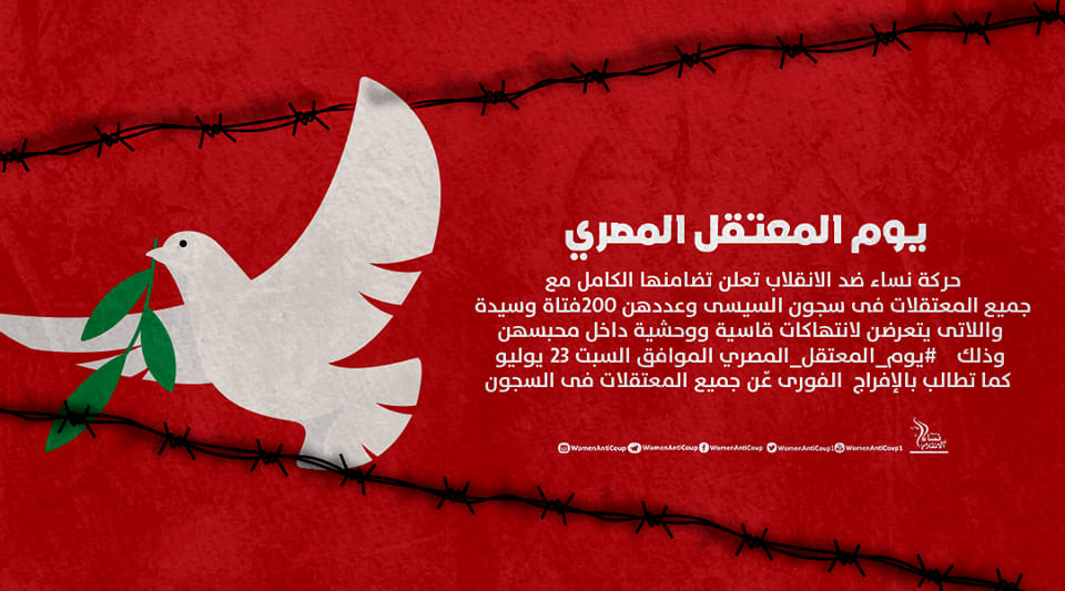 أعلنت حركة نساء ضد الانقلاب عن تضامنها مع جميع المعتقلات في سجون السيسي وعددهن 200 فتاة وسيدة بالتزامن مع يوم المعتقل الذي أطلقته رابطة شباب المعتقلين مؤخرا ، والذي يوافق السبت 23 يوليو الجاري .