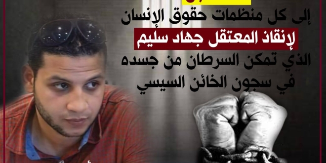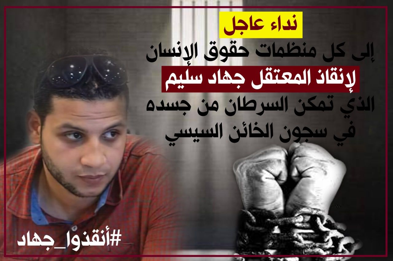 مؤخرا وثقت عدد من المنظمات الحقوقية استغاثة المعتقل " جهاد عبدالغني محمد سليم " بعدما تمكن منه السرطان ، وسط تعنت الجهات المعنية في السماح بحصوله على حقه في العلاج وإجراء عملية جراحية مقررة له من الأطباء بعد فشل جلسات الكيماوي ، في الحد من آلامه المتصاعدة يوما بعد الآخر.