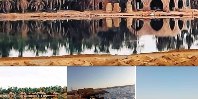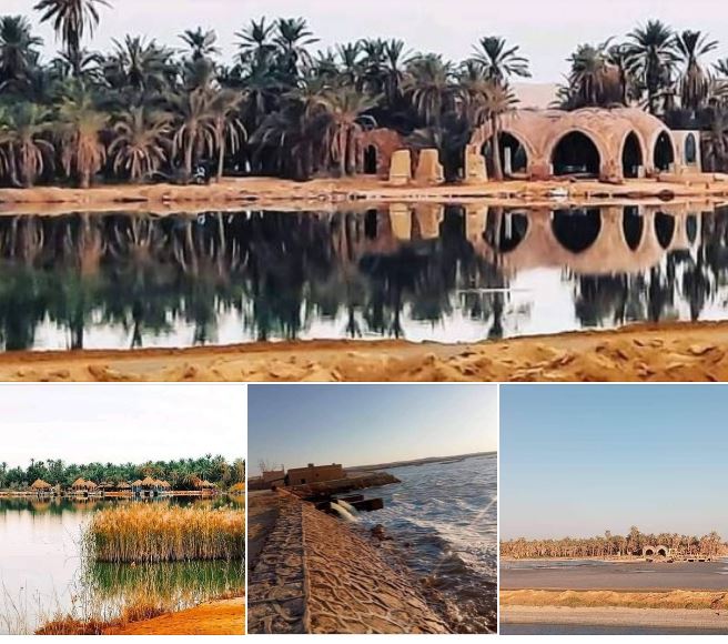 وبها عين للمياه تعد من أجمل العيون الموجودة بالواحة والتي تقع وسط الجزيرة تحيط بها الكثير من أشجار النخيل ويبلغ عمقها حوالي سبعة أمتار ويوجد بها حوالي عشرة منابع يخرج منها الماء ، يحدها من الغرب بحيرة كبيرة تمتد على بعد حوالي 6 كم حتى منطقة جعفر ومن الشرق أعداد كثيرة من الأشجار والنخيل ومن الشمال بحيرة كبيرة في طريق قرية المراقي ومن الجنوب عدد كبير من الأشجار والنخيل وبعض الزراعات الأخرى حتى طريق بئر واحد ( هذا اسم البئر ) وبحر الرمال العظيم.
