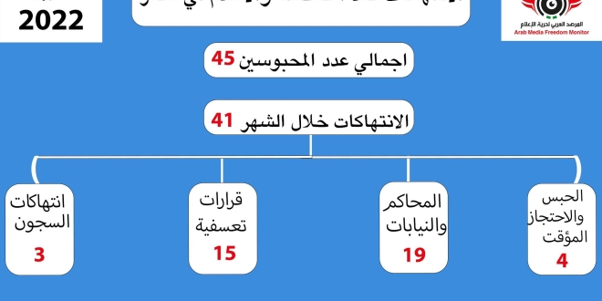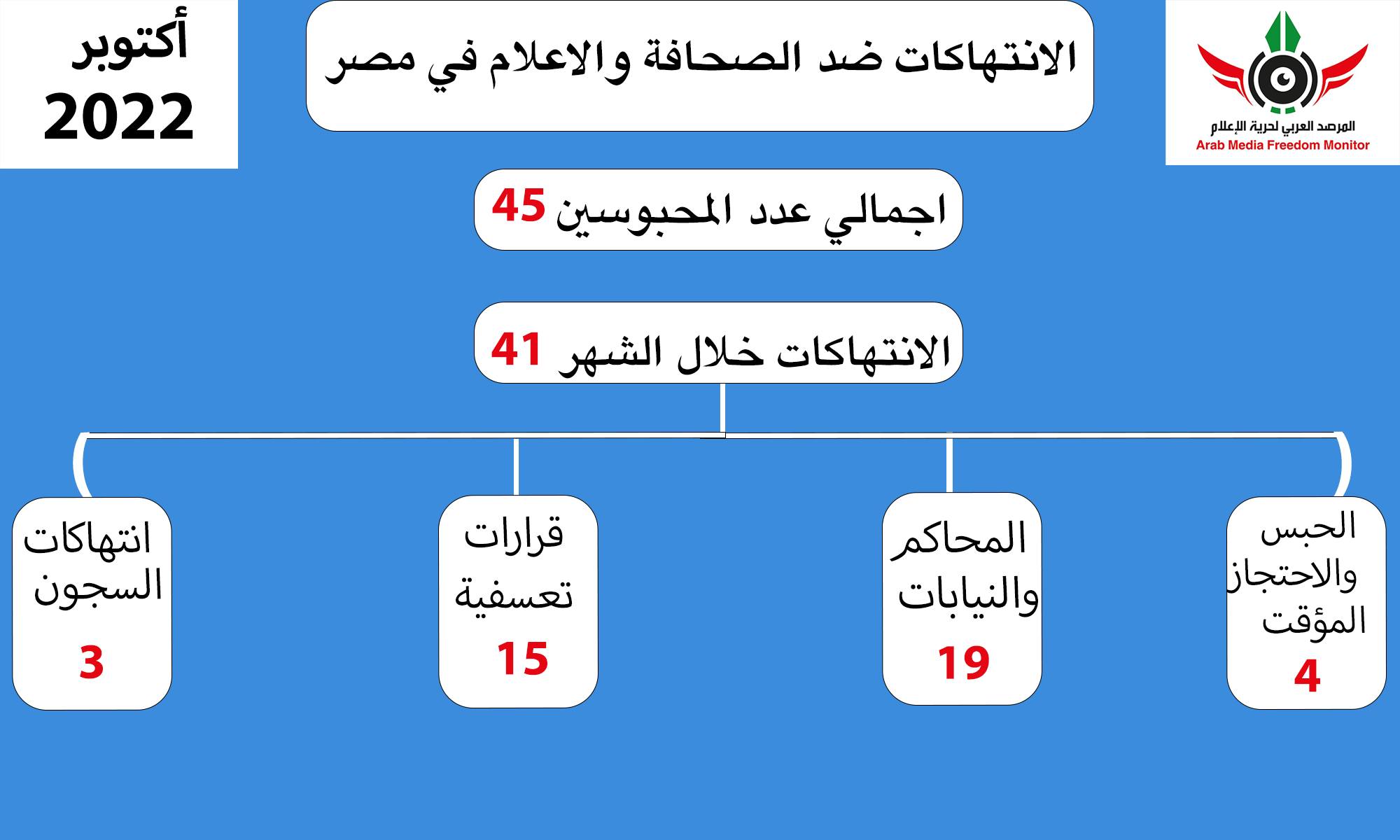 وثق المرصد العربي لحرية الإعلام في تقرير عن انتهاكات الإعلام في مصر لشهر أكتوبر المنقضي  (٤١) انتهاكا، تصدرها  من حيث العدد، انتهاكات المحاكم والنيابات بـ(١٩) انتهاكا، تلاها القرارات الإدارية التعسفية بـ(١٥) انتهاكا، ثم الحبس والاحتجاز المؤقت بـ(٤) انتهاكات، ثم انتهاكات السجون بـ(٣) انتهاكات مع استمرار حبس 45 صحفيا وإعلاميا بينهم 3 تم القبض عليهم مؤخرا .