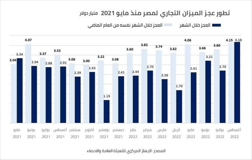 أوضحت بيانات جهاز التعبئة العامة والإحصاء، وصول قيمة العجز في الميزان التجاري لمصر إلى 4.18 مليار دولار، مقابل 4.15 مليار دولار خلال الشهر نفسه من 2021.