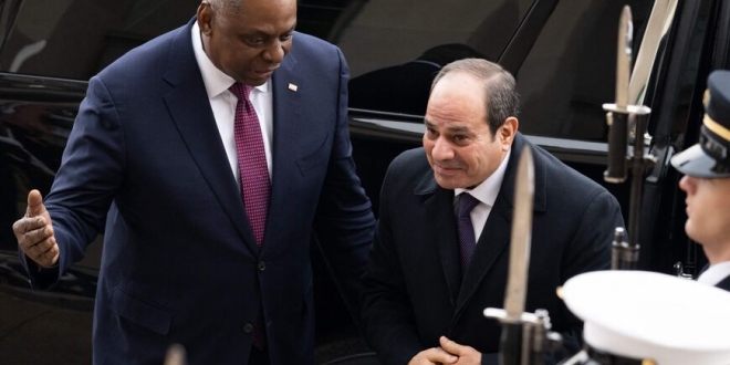 US Secretary of Defense Lloyd Austin greets Egyptian President Abdel Fattah El-Sisi (R) as he arrives for meetings at the Pentagon in Washington, DC, December 14, 2022. (Photo by SAUL LOEB / AFP) (Photo by SAUL LOEB/AFP via Getty Images)