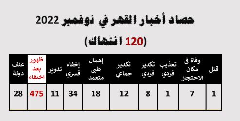رصد "أرشيف حصاد القهر" لشهرنوفمبر الماضي 2022 الصادر عن مركز النديم لمناهضة العنف والتعذيب 120 انتهاكا متنوعا بينها 7 حالات وفاة داخل مقار الاحتجاز و18 حالة إهمال طبي داخل السجون و28 حالة عنف للدولة وحالة قتل واحدة .