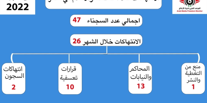 وثق المرصد العربي لحرية الإعلام 26 انتهاكا في تقريره انتهاكات عن حرية الصحافة والإعلام في مصر لشهر ديسمبر المنقضي لعام ٢٠٢٢ واستمرار حبس 47 صحفيا وصحفية. حيث جاء على رأس الانتهاكات المحاكم والنيابات بـ(١٣) انتهاكا، ثم القرارات الإدارية التعسفية بـ(١٠ انتهاكات)، ثم انتهاكات السجون بـ(انتهاكين) ثم المنع من النشر بانتهاك واحد.