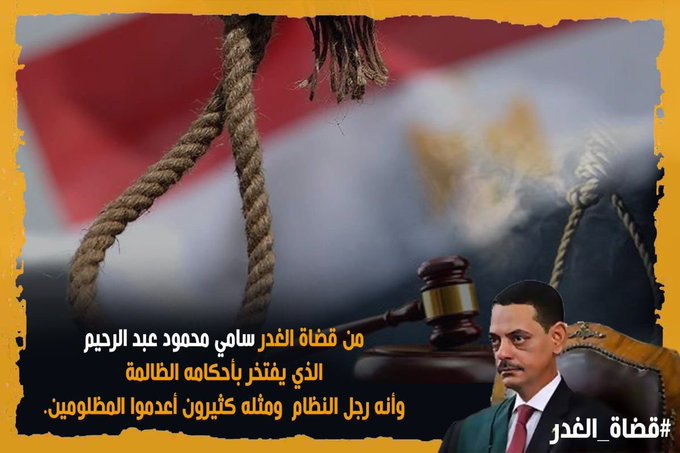 حساب "تيم المرابطون" @morabetoooon قال "من قضاة الغدر سامي محمود عبد الرحيم الذي يفتخر بأحكامه الظالمة ، وأنه رجل النظام ومثله كثيرون أعدموا المظلومين."