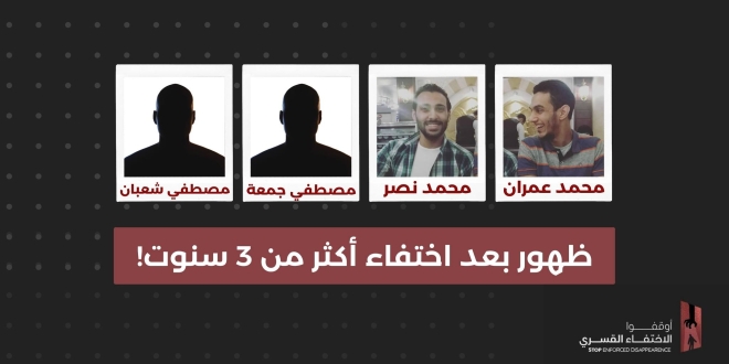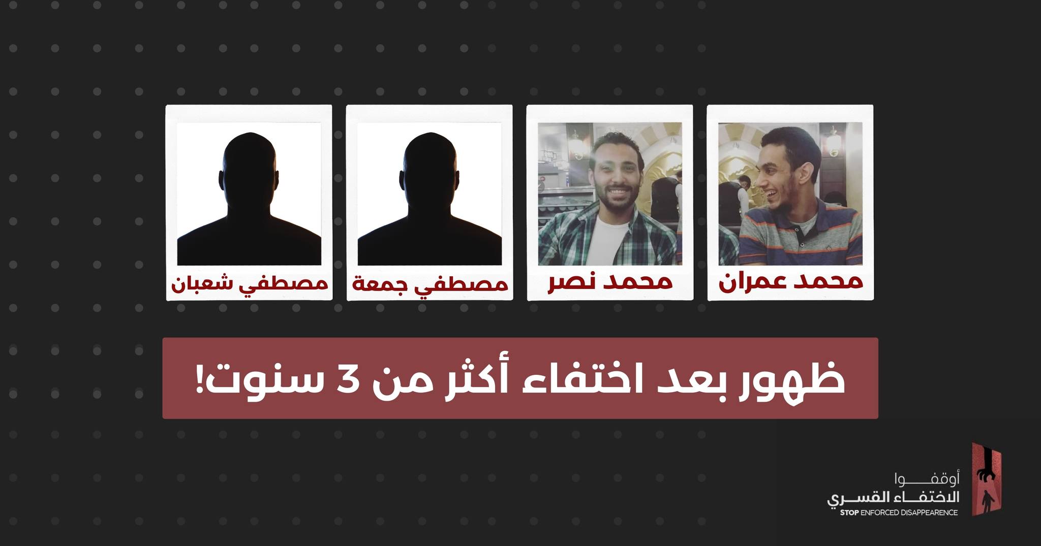 وأشارت إلى أنهما انضما إلى محمد عزت طه، 27 سنة، ومحمد نصر عبد الحميد، 32 سنة، اللذين كانا مختفيين قسريا أيضا منذ أكثر من ثلاث سنوات وظهرا مؤخرا أمام نفس النيابة .