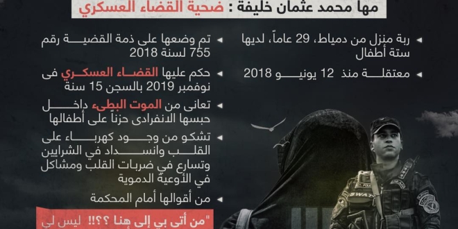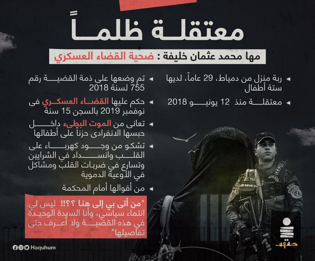 طالبت حركة "نساء ضد الانقلاب" بإنقاذ المعتقلة مها محمد عثمان خليفة، البالغة من العمر 29 عاما، وهي متزوجة وأم لستة أطفال، وتدخل عامها الخامس في سجون السيسي على ذمة القضية رقم 755 أمن دولة لسنة 2018 التي أُحيلت للمحكمة العسكرية، وحكم عليها بالسجن 15 عاما في نوفمبر 2019 وتصارع الموت بعد تدهور حالتها الصحية.