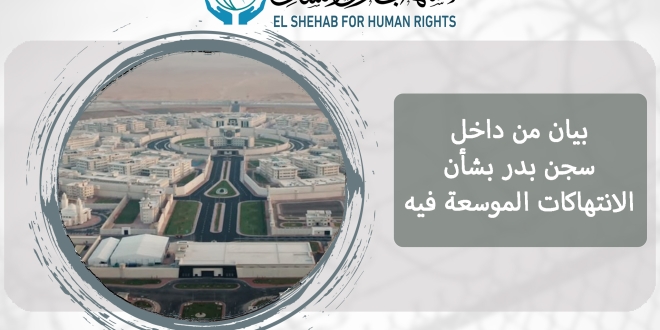 ونشر مركز الشهاب لحقوق الإنسان البيان الذي أشار إلى التعنت الشديد من إدارة سجن بدر٣ في عدم السماح للأهالي بزيارة ذويهم المعتقلين، الأمر الذي وصلت مدته إلى أكثر من ٧ سنوات، بالإضافة إلى انتهاكات أخرى بحق المعتقلين بينها عدم وجود تريض بشكل كلي لكل المحبوسين سواء احتياطيا أو محكومين وضعف الوجبات المقررة، حيث لا تكفي لإطعام طفل صغير، إضافة إلى الحالة الصحية المتدهورة والمأساوية، فضلا عن عدم وجود ماكينات للحلاقة أو شفرات مطلقا.