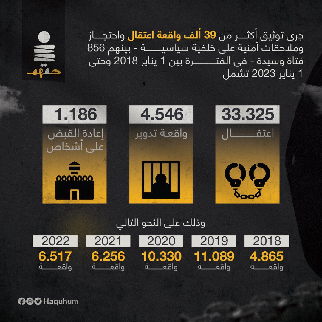 رصد مركز شفافية للأبحاث والتوثيق وإدارة البيانات 39057 واقعة قبض واستيقاف وملاحقة أمنية وقضائية على خلفية سياسية خلال الفترة من 1 يناير 2018 وحتى 1 يناير عام 2023 .