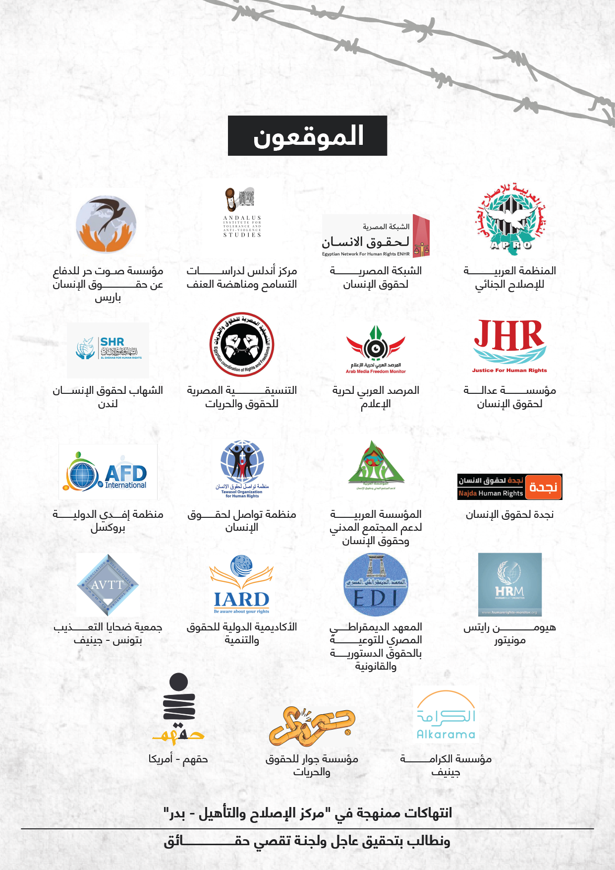أعربت 19 منظمة حقوقية في بيان مشترك صادر اليوم عن قلقها الشديد من الانتهاكات الجسيمة التي ترتكبها سلطات النظام الانقلابي في مصر، داخل "مركز الإصلاح والتأهيل – بدر" والمعروف بـ "مجمع سجون بدر 1 ، 2 ، 3" والتي تشكل خرقا صارخا للدستور المصري والقوانين والمواثيق والمعاهدات الدولية كافة، ومخالفة واضحة للقواعد الدنيا في معاملة السجناء المعتمدة من الأمم المتحدة.