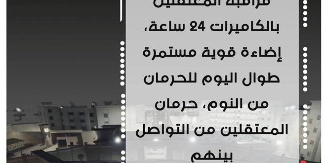 يضاف إلى هذا انتهاك الخصوصية عبر كاميرات المراقبة بالصوت والصورة داخل الزنازين، والتفتيش المتكرر المصحوب بالاعتداء على المعتقلين بالضرب المبرح والإهمال الطبي المتعمد، والحرمان من الحق في العلاج والحبس الانفرادي غير المبرر لمدد طويلة والحرمان من أدوات النظافة الشخصية، فضلا عن المعاملة القاسية والمهينة والحط من الكرامة الإنسانية.