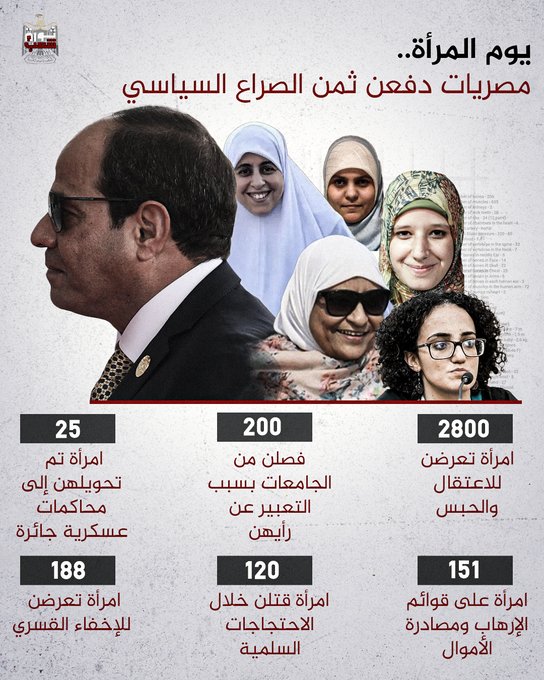 وأضاف حساب (@Germanheco44)، "بأي عين يحتفلون في مصر باليوم العالمي للمرأة وهم ينتهكون حريتها منذ عشرسنوات اعتقال قسري وعلني وأحكام مؤبدة واغتصاب وتحرش داخل سجون السيسي، تشريد وقتل وتهجير واقتحام لكل مقدساتها الجسدية، بأي عين يا أصحاب الأقلام الكاذبة؟".
