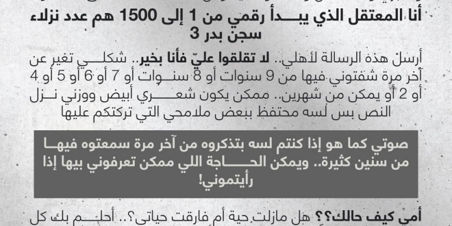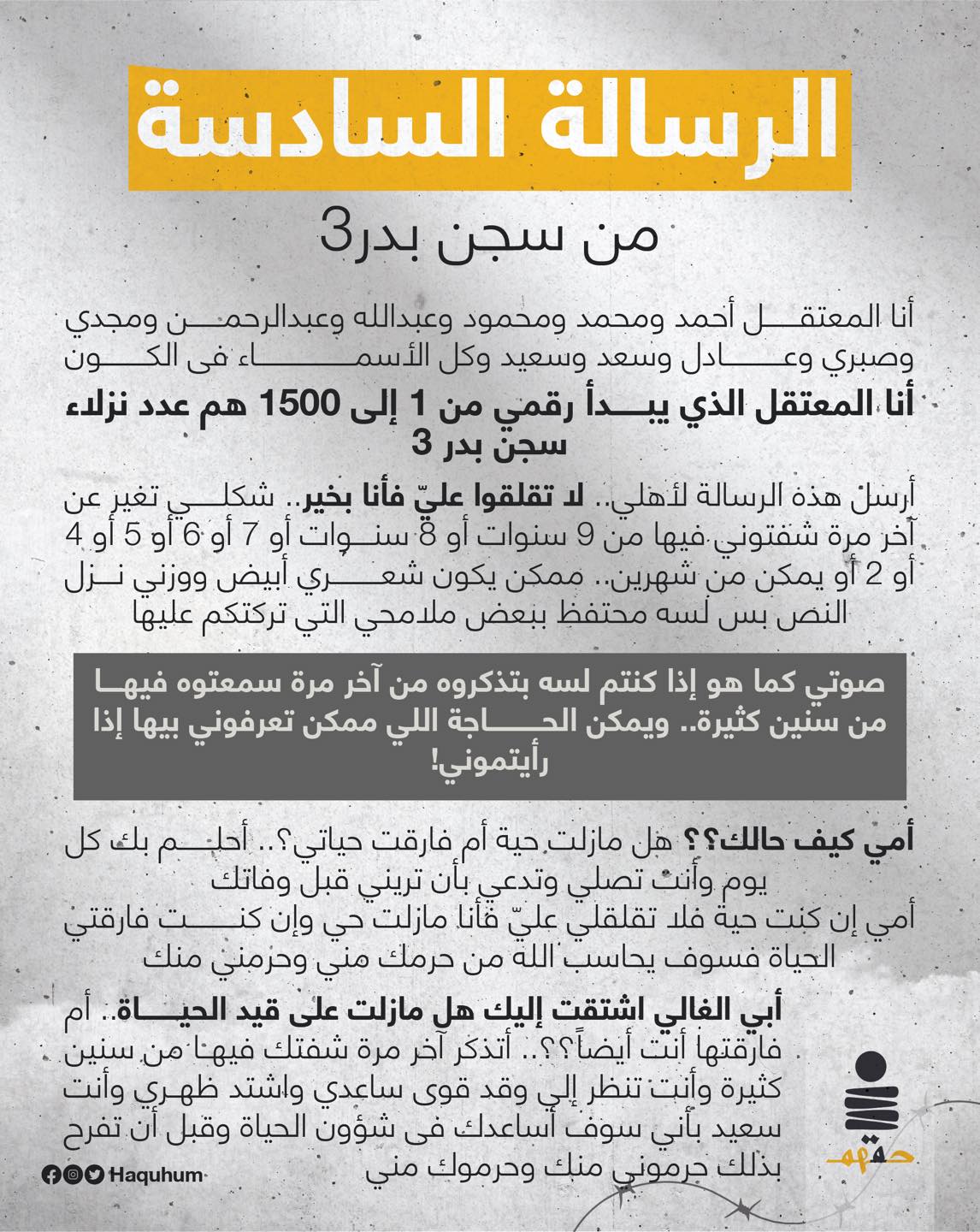 إلى ذلك نشرت عدد من المنظمات الحقوقية رسالة قالت إنها الرسالة السادسة من سجن بدر 3 جاء فيها: