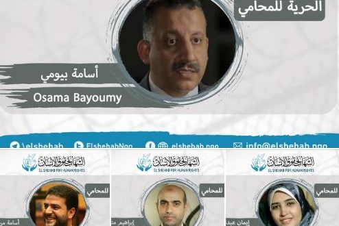 جدد مركز الشهاب لحقوق الانسان المطالبه بالحرية لجميع المحامين المدافعين عن حقوق الانسان من القابعين فى سجون النظام الانقلابى منذ سنوات دون جريمة حقيقة على خلفية اتهامات ومزاعم ملفقه لا لذنب غير ممارسة دورهم المهنى فى الدفاع عن معتقلى الرأى .