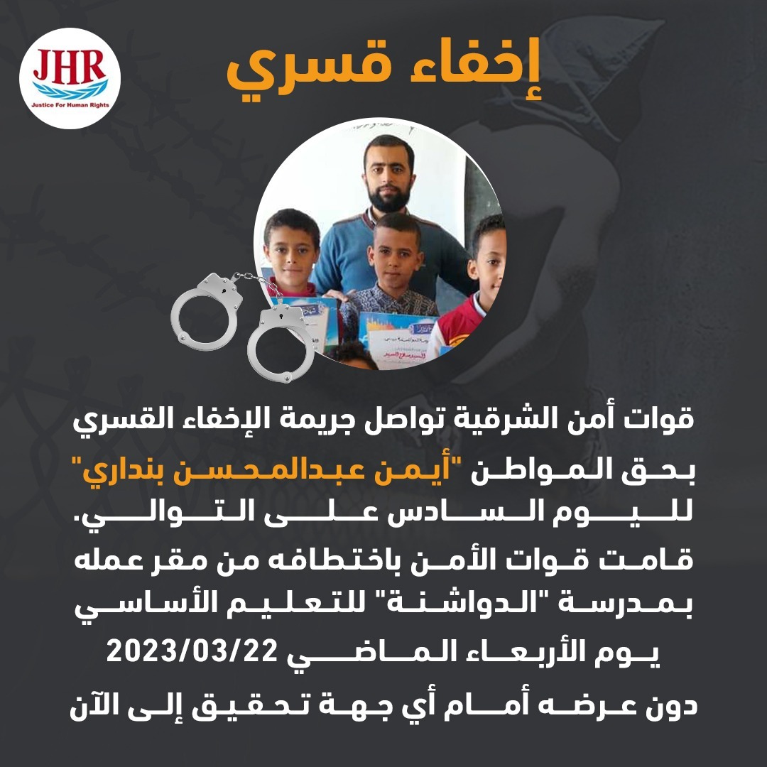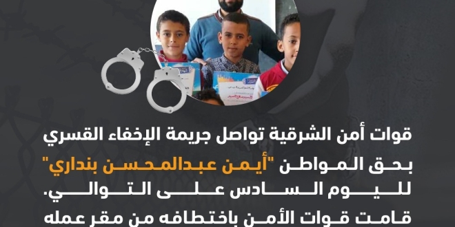 تخفي سلطات الانقلاب بالشرقية المواطن " أيمن أحمد عبدالمحسن بنداري " مدرس من أبناء مركز أبوكبير محافظة الشرقية منذ أن تم اعتقاله تعسفيا من مقر عمله بمدرسة "الدواشنة " بتاريخ 22 مارس الجاري واقتياده لجهة غير معلومة دون ذكر أسباب ذلك.