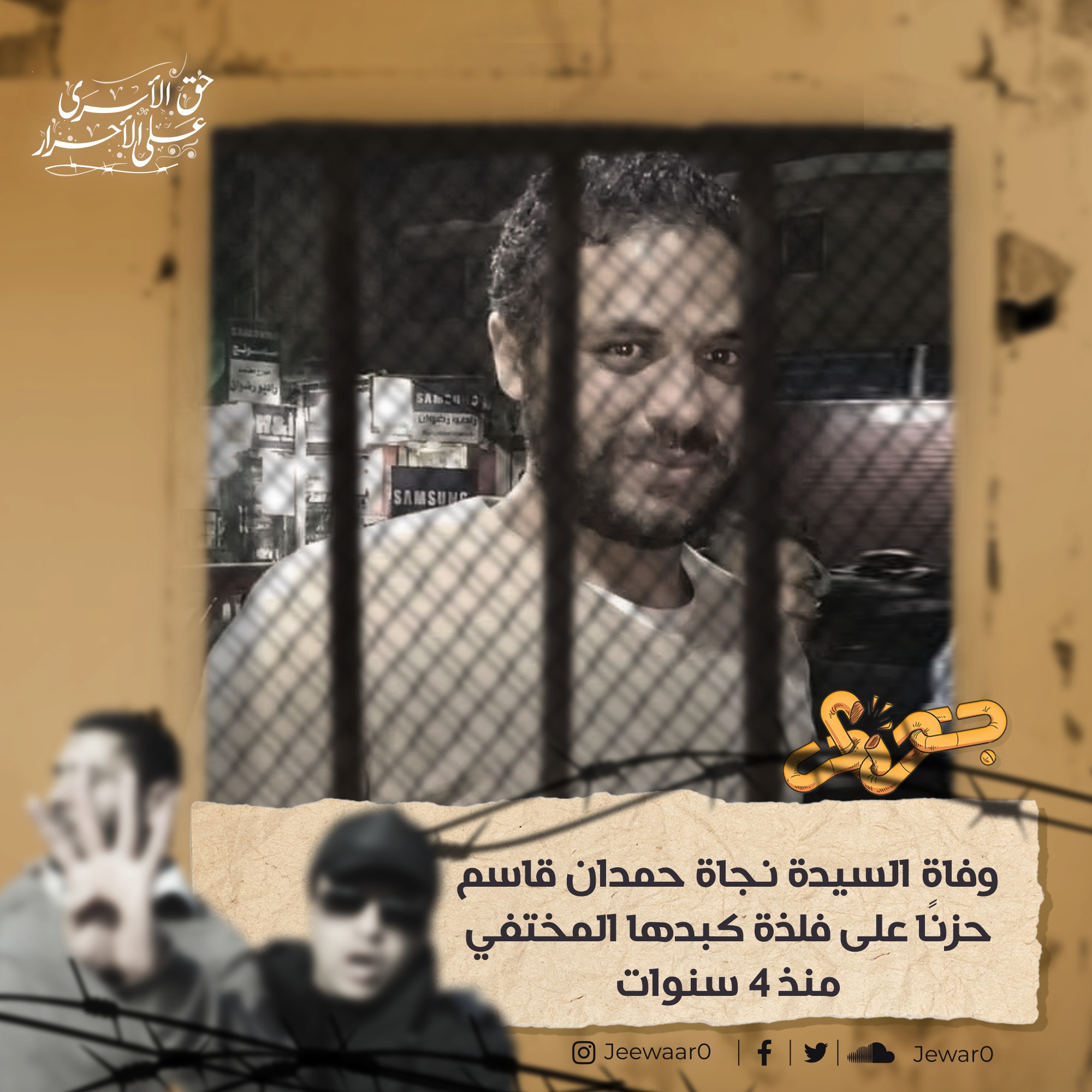 رصدت مؤسسة "جوار" الحقوقية وفاة السيدة نجاة حمدان قاسم والدة المختفي قسريا عبدالرحمن شعبان أبو الغيط، التي "توفيت حزنا على فلذة كبدها المختفي منذ 4 سنوات وكان حُلمها أن تُكحّل عينيها برؤيته".