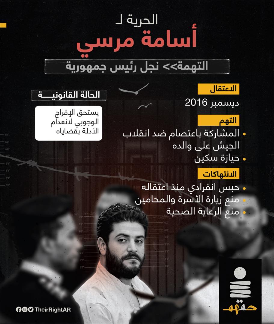 طالبت منظمة "حقهم" المختصة بالدفاع عن سجناء الرأي بالحرية للمحامي المعتقل "أسامة مرسي" الابن الأوسط للرئيس الشهيد محمد مرسي، ووقف ما يتعرض له من انتهاكات داخل محبسه الانفرادي بسجن "بدر" الذي أصبح مقبرة للقتل البطيء، بحسب ما رصدته مؤخرا العديد من المنظنمات الحقوقية.
