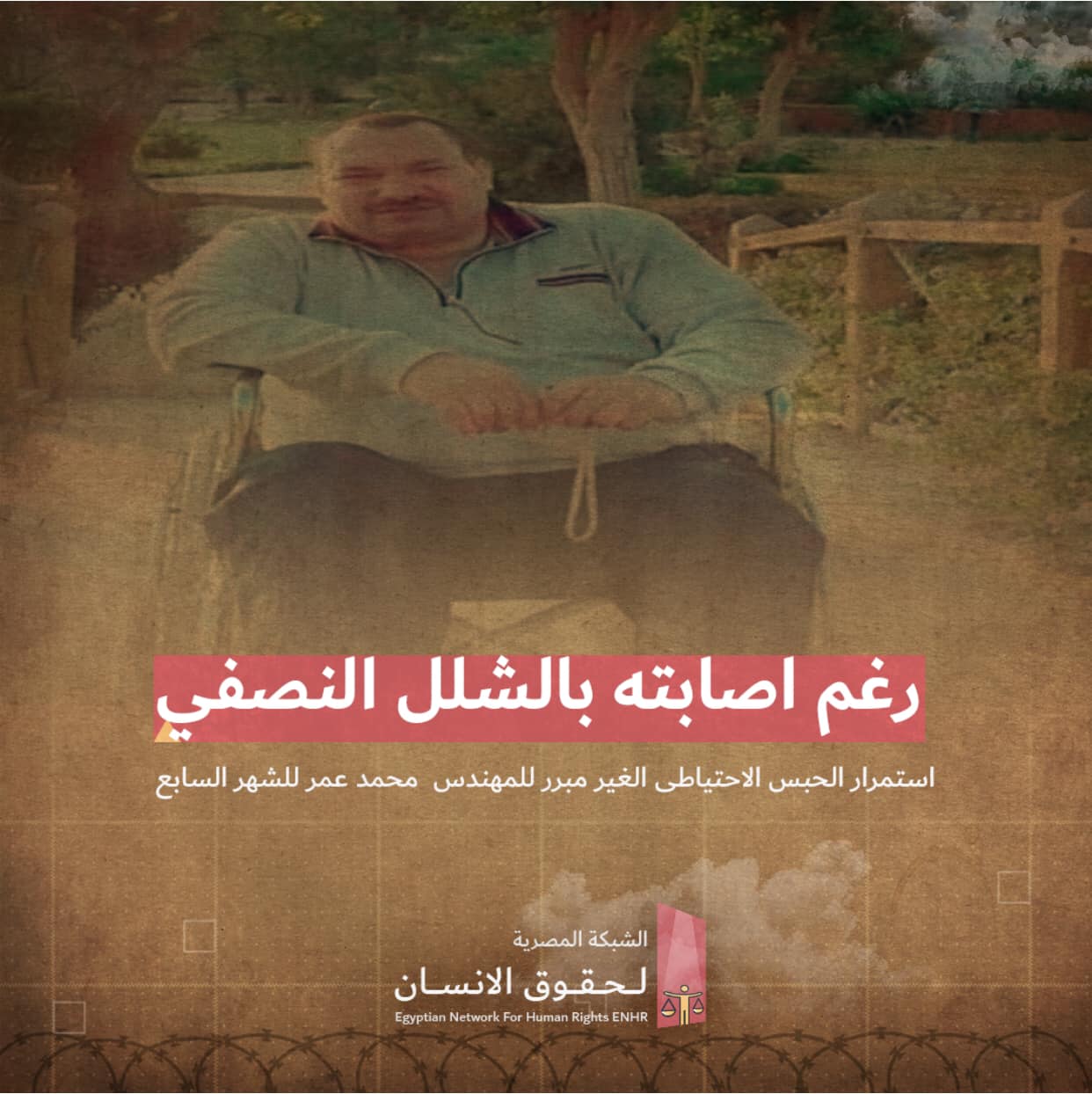 تواصل قوات الأمن بداخلية حكومة الانقلاب التنكيل بالمهندس "محمد عمر" منذ اعتقاله في نوفمبر 2022 فرغم إصابته بالشلل النصفي وتدهور حالته الصحية، يستمر تجديد حبسه احتياطيا ضمن مسلسل الانتهاكات المتوصل به وبأسرته منذ اعتقال نجلها عمرو محمد الطالب بكلية الهندسة، وإخفائه قسريا بتاريخ 8 يوليو 2019 وحتى الآن .