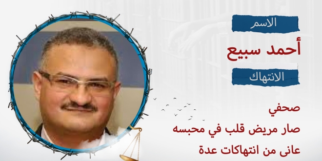 رصدت عدد من المنظمات الحقوقية استغاثة أسرة الصحفي “أحمد سبيع” لرفع الظلم الواقع عليه، بعد تدهور حالته الصحية في محبسه نتيجة لظروف الاحتجاز المأساوية ومعاناته من مرض القلب .