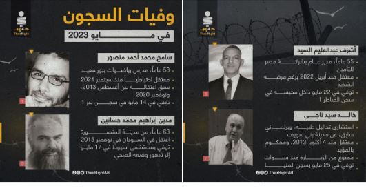 رصدت منظمة “حقهم” المختصة بالدفاع عن سجناء الرأي ارتقاء 4 معتقلين خلال مايو المنقضي، بعدما تم احتجازهم في ظروف قاسية داخل السجون ومقار الاحتجاز التي تفتقر لأدنى معايير سلامة وصحة الإنسان.