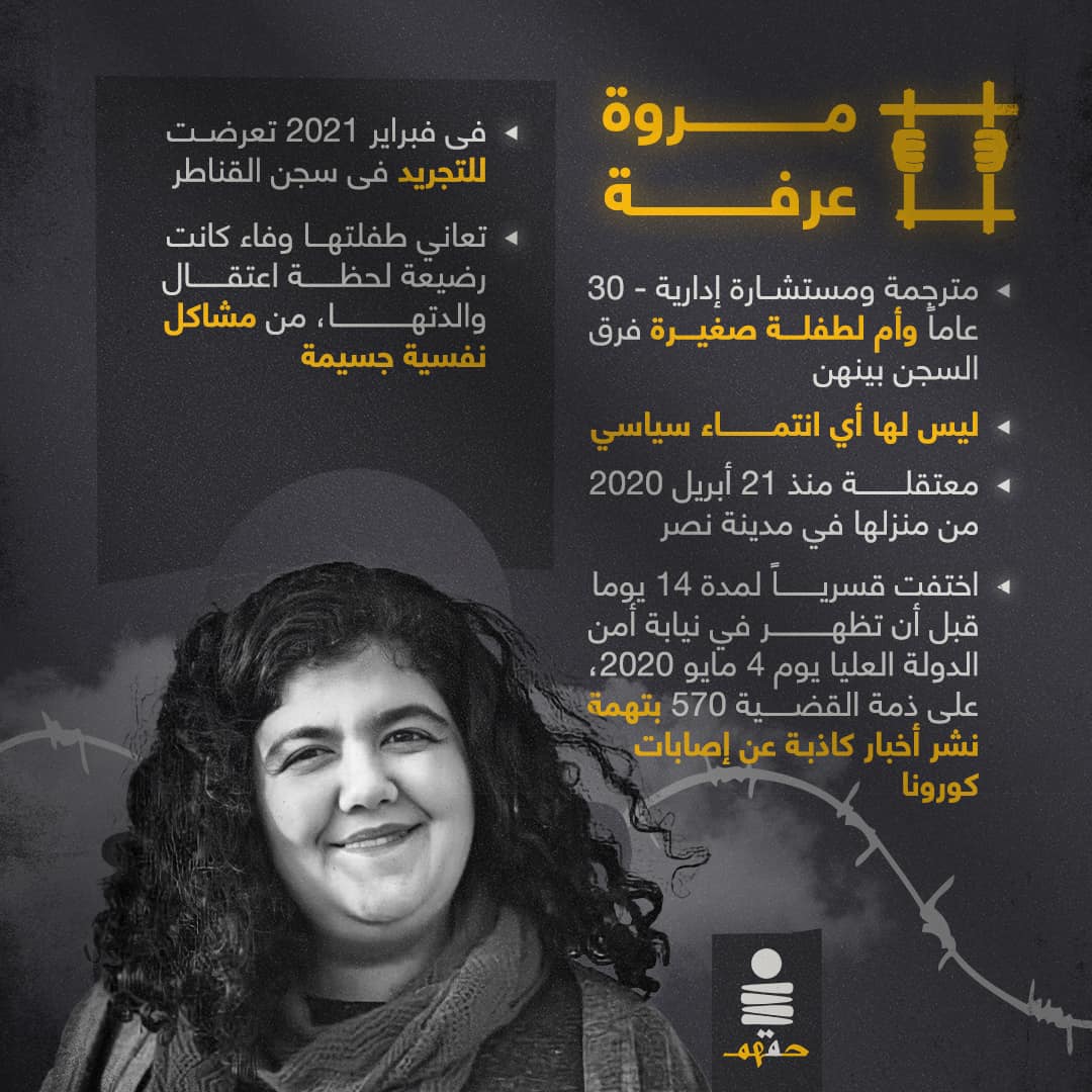 وقالت المنظمة عبر حسابها على فيس بوك : “مروة عرفة مترجمة اعتقلت من منزلها في أبريل 2020 وتعرضت للإخفاء القسري لمدة 15يوما، وبعدها ظهرت في النيابة على ذمة قضية ملفقة”.