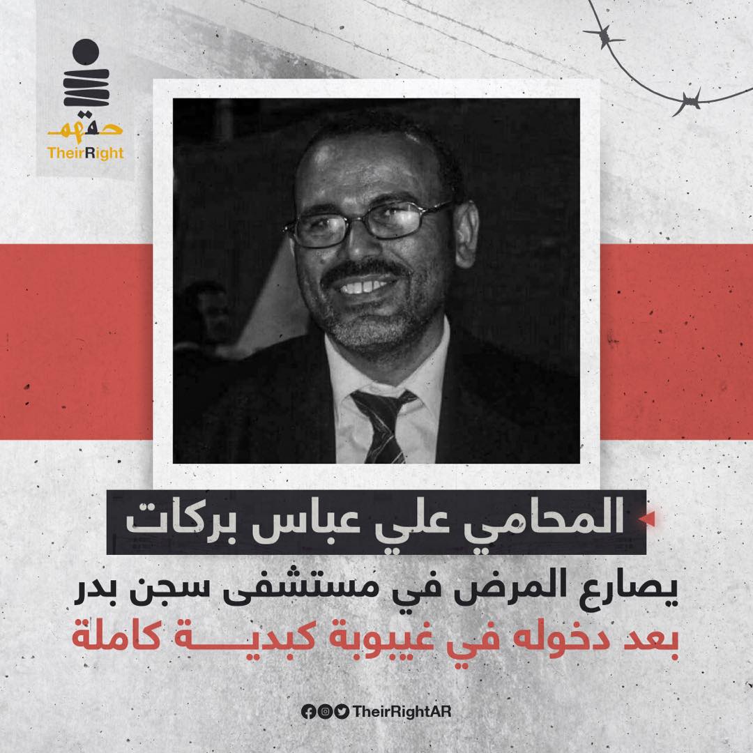 ورصدت “لجنة العدالة” للدفاع عن حقوق الإنسان نقل المحامي والمدافع الحقوقي “علي عباس بركات” إلى مستشفى سجن “بدر”؛ وبحسب زوجة “بركات”، فإن زوجها تعرض لغيبوبة كبدية كاملة، تم على إثرها نقله إلى مستشفى سجن “بدر” في حالة فقدان كامل للوعي، بعد تدهور حالته الصحية نتيجة إصابته بمرض فيروس الكبد الوبائي فئة “C”.