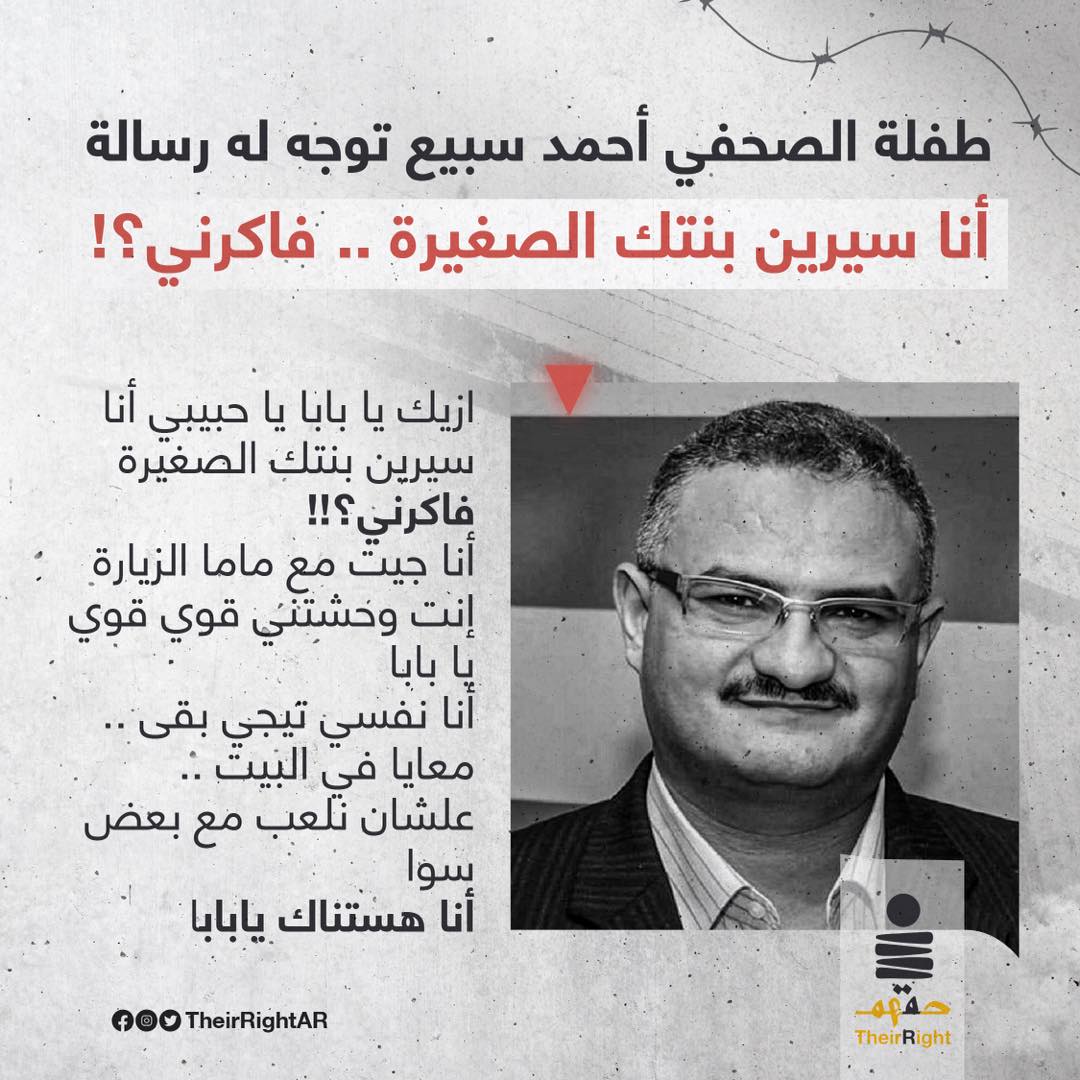 وتضامنت منظمة حقهم مع زوجة سبيع ونقلت ما كتبته قبل أيام عبر حسابها على فيس بوك، حيث كشفت عن الأثر السلبي لحرمان طفلتها من والدها وقالت : “سيرين بقالها مدة اتعودت إنه لما تبقى عايزه تتكلم مع باباها أو تقوله حاجة تمسك الموبايل وتسجل فويسات علي برنامج المسجل وتقولي عشان لما بابا يرجع يسمعها ويعرف أنه كان واحشني النهاردة صحيت على صوتها وهي بتسجل فويس بتقول فيه: “فاكرني”.