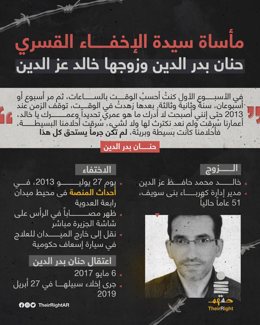 إلى ذلك قالت منظمة "حقهم" المعنية بالدفاع عن سجناء الرأي إن قصة حنان بدر الدين وخالد عز الدين، تمثل واحدة من مرثيات عشرية القهر والظلام في مصر، وهي تشبه آلاف القصص غيرها.