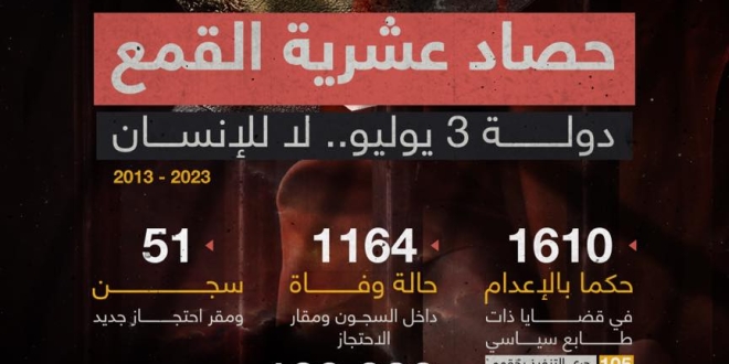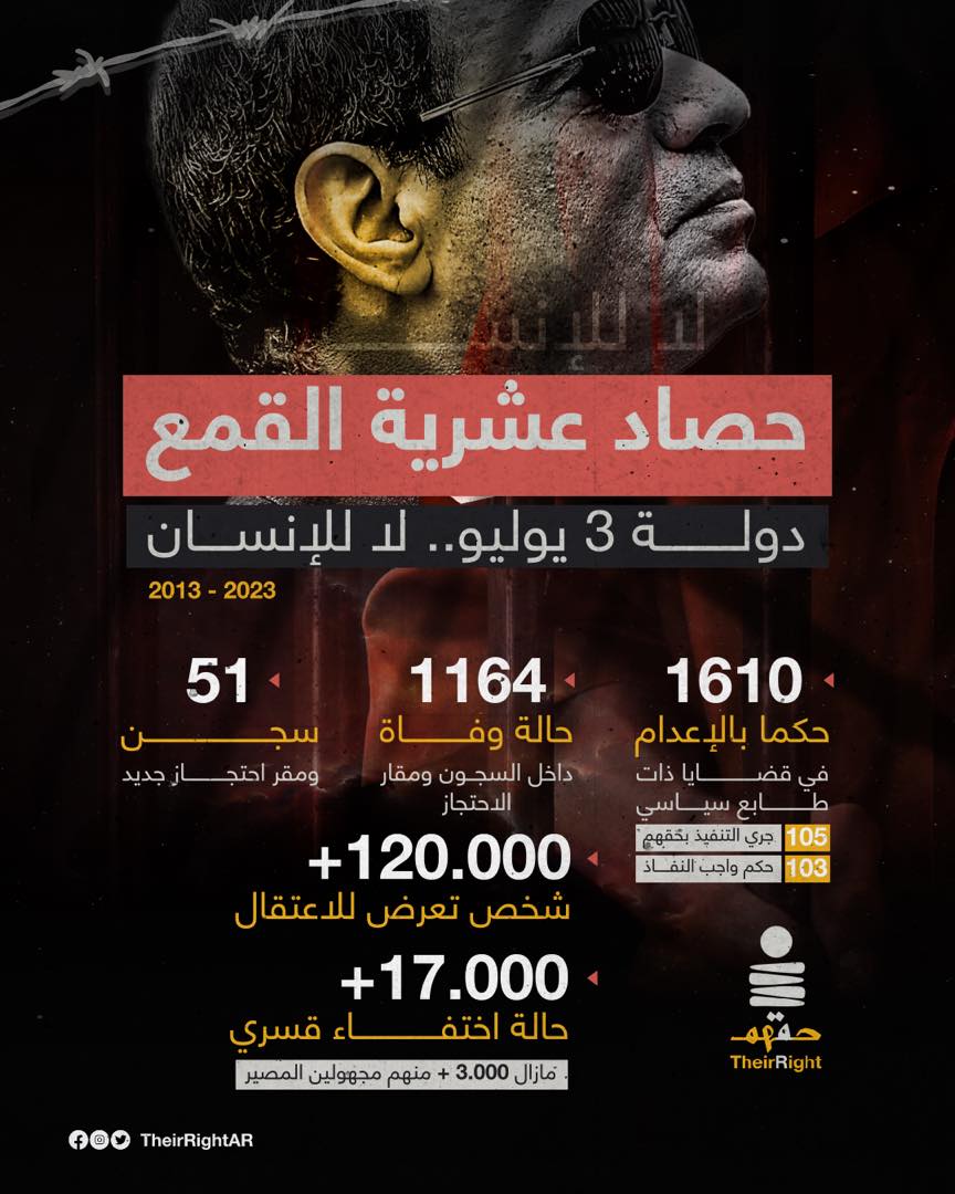 ضمن حصاد عشرية الظلم والقمع رصدت منظمة "حقهم" المعنية بالدفاع عن معتقلي الرأي بعضا من ملامح الصورة القمعية التي صنعها النظام الانقلابي خلال الـ10 سنوات الماضية منذ انقلاب الثالث من يوليو 2013.