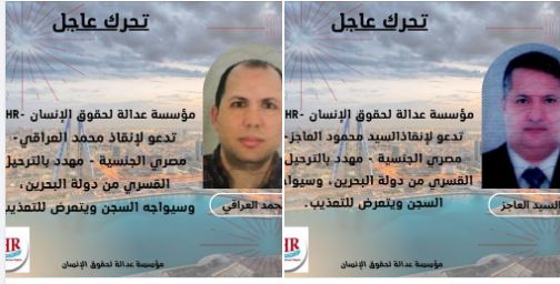 إلى ذلك دعت "مؤسسة عدالة لحقوق الإنسان" لتحرك عاجل لإنقاذ رجل الأعمال المصري السيد محمود العاجز  والمهندس  محمد العراقي سعد حسانين  من الترحيل القسري إلى مصر، بعد توقيفهما بدولة البحرين المقيمان بها منذ نحو 8 سنوات .