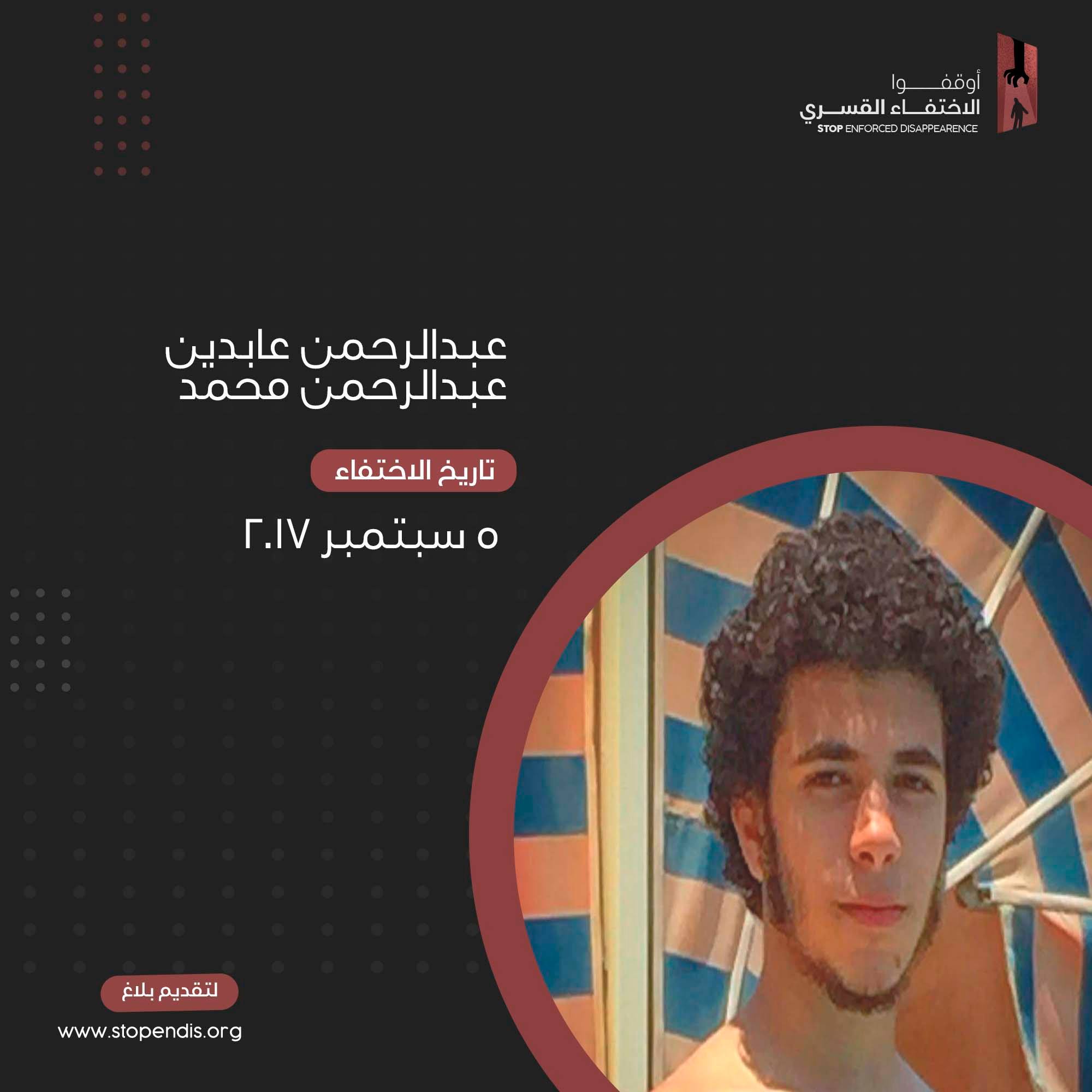 وفي القاهرة أيضا ترفض سلطات الانقلاب الكشف عن مصير الشاب عبدالرحمن عابدين عبدالرحمن محمد الذي تم اعتقاله يوم 5 سبتمبر 2017 بعد توقيفه في كمين للشرطة بنفق الشهيد أحمد حمدي بمدينة السويس.
