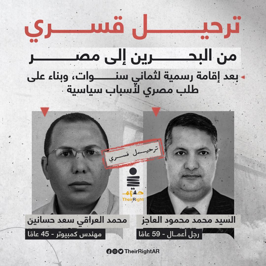 أكدت منظمة ” حقهم ” المعنية بالدفاع عن معتقلي الرأي على استمرار الاختفاء القسري بحق المواطنين السيد العاجز ومحمد العراقي، اللذين جرى ترحيلهما قسرا من دولة البحرين إلى مصر، حيث لم يتم عرضهما على النيابة، ولا يعلم مكان تواجدهما وسط مخاوف على سلامتهما .