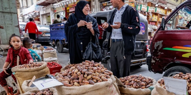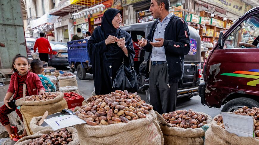 In this picture taken on March 22, 2023, a woman speaks with a merchant as she shops for dates at the traditional Rod el-Farag market in northern Cairo during the Muslim holy fasting month of Ramadan. - Muslims follow the tradition set by the prophet Mohammed whom believers say used to break his fast by eating dates and drinking goat's milk during the holy month. The dawn-to-dusk fast is conceived as a spiritual struggle against the seduction of earthly pleasures, but the evening iftar festive meals traditionally bring families together during Ramadan. (Photo by Khaled DESOUKI / AFP) (Photo by KHALED DESOUKI/AFP via Getty Images)
