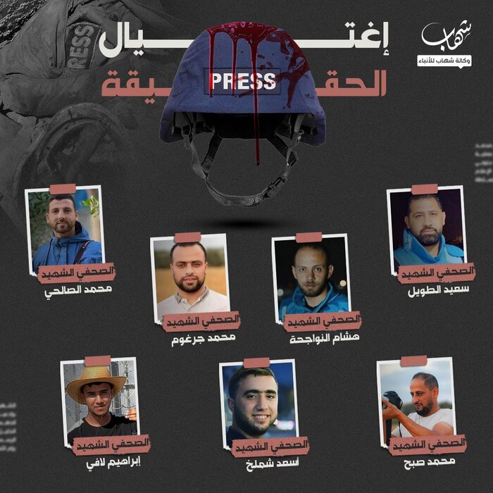 وأظهرت الصور ملابس صحفيين وهي ملطخة بالدماء، وصحفيين يبكون ويترحمون على زملائهم الذين سقطوا جراء الغارة الإسرائيلية.