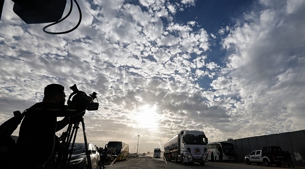 Media representatives work as a truck of the United Nations Relief and Works Agency for Palestine Refugees (UNRWA) carrying fuel arrives at the Egyptian side of the Rafah border crossing with the Gaza Strip on November 22, 2023, amid ongoing battles between Israel and the Palestinian militant group Hamas. (Photo by Khaled DESOUKI / AFP) (Photo by KHALED DESOUKI/AFP via Getty Images)