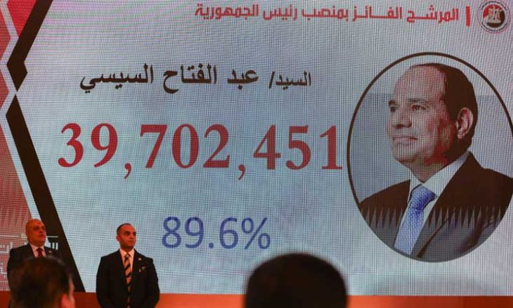 وحصل السيسي، الذي صعد إلى السلطة بعد انقلاب في عام 2013 ، على ما يقرب من 90 في المائة من الأصوات ، حسبما أعلن مسؤولو الانتخابات في مؤتمر صحفي أمس الاثنين. وحصلت حفنة من المرشحين غير المعروفين الذين خاضوا الانتخابات ضده، ولم يشكل أي منهم تحديا موثوقا به على حوالي 10 في المائة من الأصوات فيما بينهم.