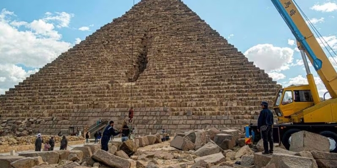ونشرت مقاطع فيديو الأسبوع الماضي تظهر مسؤولا مصريا يشرف على أعمال الترميم في الهرم الذي يقع بالقرب من تمثال أبي الهول في الجيزة.