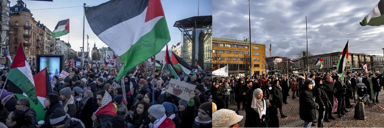 وبث ناشطون مقاطع من مظاهرة في مدينتي مالمو أوبسالا في السويد، حيث طالب المتظاهرون بمقاطعة إسرائيل وإنهاء الحرب على قطاع غزة.
